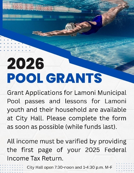 Grant Applications for Lamoni Municipal Pool passes and lessons for Lamoni youth and their household are available at City Hall. Please complete the form as soon as possible (while funds last).
